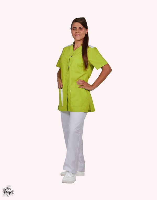 Tunique femme. Fermeture milieu par bouton-pression sous patte. 1 poche poitrine. 2 poches basses à soufflet. Manches courtes. Poche stylo sur manche gauche. Fentes aux cotés. Plis d'aisance dos. Longueur : 75 cm